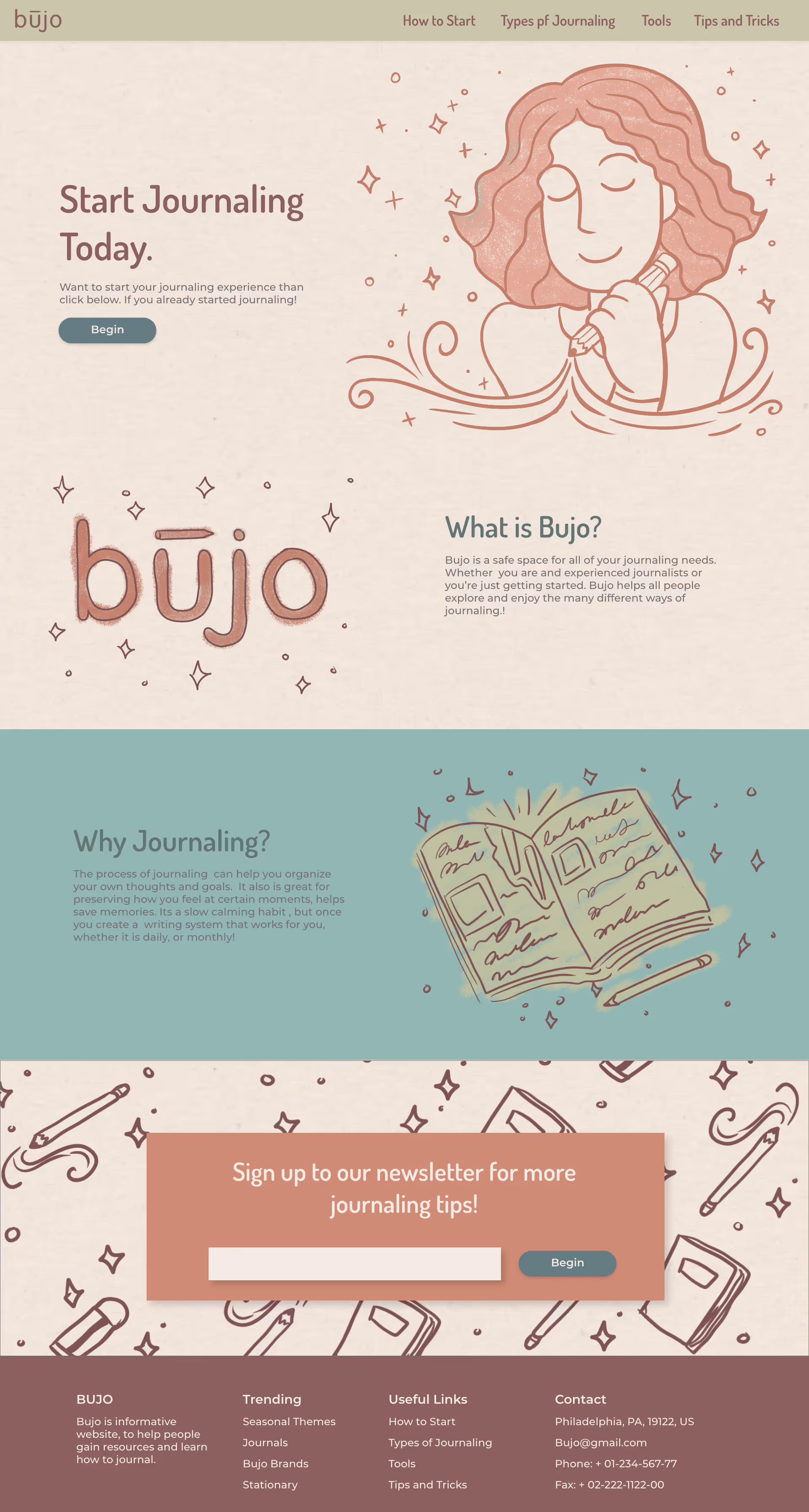 Bujo is a how-to bullet journal website concept that is to cater to teens and young adults in learning how to start journaling and what methods to bring your journaling to the next level.